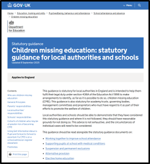 This guidance is statutory for local authorities in England and is intended to help them fulfil their legal duty under section 436A of the Education Act 1996 to make arrangements to identify, as far as it is possible to do so, children missing education (CME).
