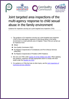 On 10 September Ofsted, CQC, HMICFRS and HMIProbation published new JTAI guidance for inspections of the response to child sexual abuse in the family environment