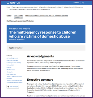 On 21 January the Ofsted, CQC, HMIFRS and HMIProbation published a review of recent JTAI reports on children who are victims of domestic abuse
